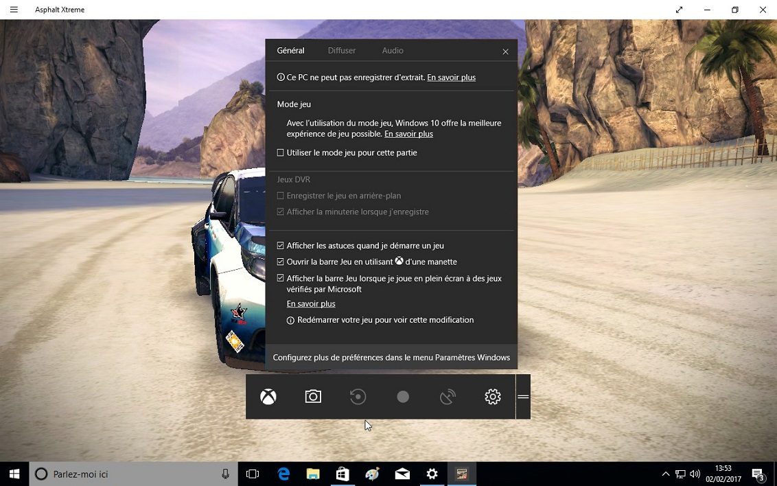 Par exemple, l’activation du mode Jeu est censé rendre l’affichage plus fluide en octroyant aux jeux le maximum des ressources du processeur et de la carte graphique. Microsoft a également prévu une barre d’outils qui s’active dans le jeu par la séquence de touches et offre des fonctions telles que l’enregistrement de séquences vidéo, la capture d’images et la diffusion de parties.