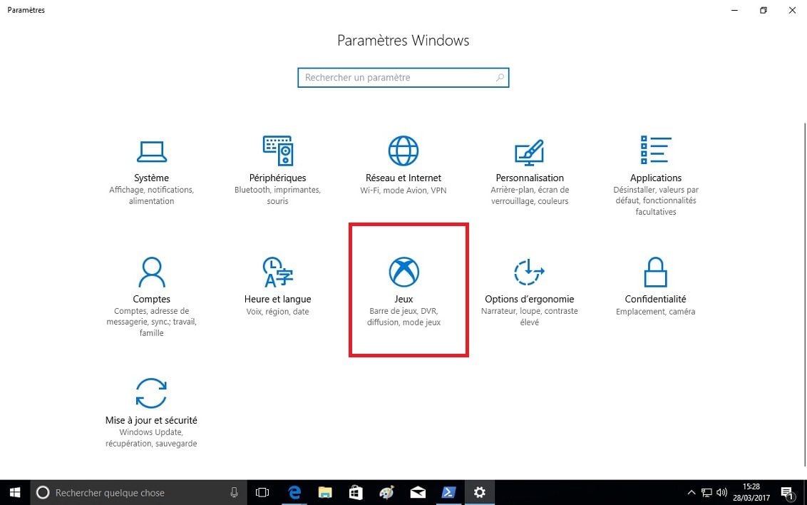 Dans les paramètres de Windows 10, une nouvelle icône fait son apparition avec le logo Xbox. Cela permet d’accéder aux différents réglages et options destinés aux jeux.