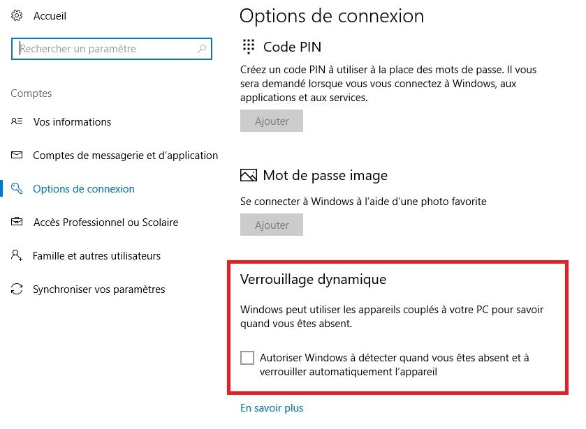 Enfin, la Creators Update introduit la fonction de verrouillage dynamique. Après avoir associé un appareil Bluetooth, par exemple son smartphone, Windows 10 va surveiller si l’appareil est à portée de signal et verrouiller le poste automatiquement si la liaison est rompue pendant plus de 30 secondes.
