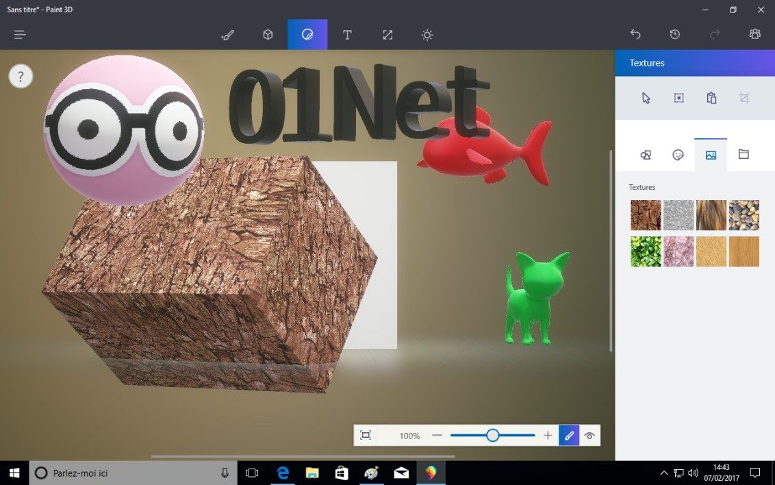 Paint 3D est incontestablement de programme phare de cette « mise à jour pour les créateurs ». Il permet de concevoir très facilement des scènes 3D, même si on est nul en dessin. Le programme comporte des objets prêts à l’emploi et transforme rapidement un texte 2D en texte 3D.