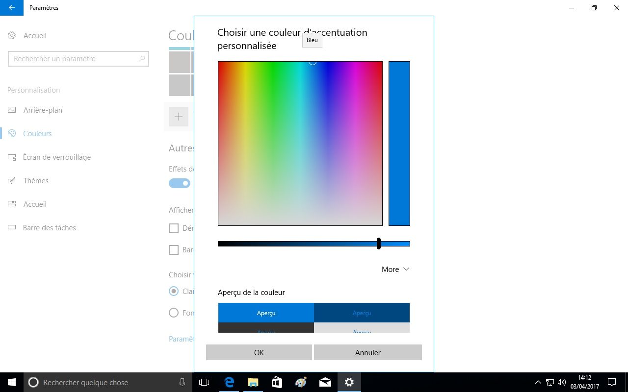 Enfin, les paramètres d’affichage permettent de choisir précisément la couleur d’accentuation utilisée dans le menu Démarrer et la barre des tâches, avec des exemples de rendu.