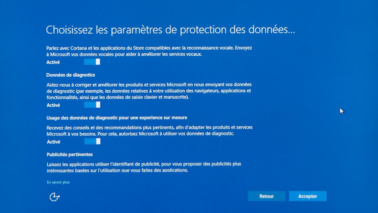 Microsoft a subi de nombreuses critiques sur la gestion de la vie privée par Windows 10. L’éditeur rectifie le tir avec la Creators Update. Lors de la phase d’installation, un écran de configuration apparaît avec plusieurs interrupteurs pour configurer les différents paramètres liés à la vie privée.