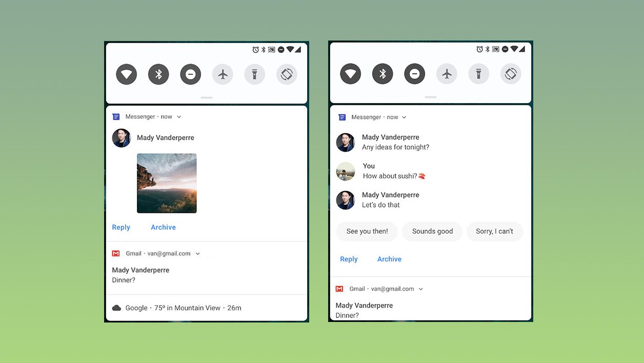 Comme chaque année depuis l’arrivée d’Android Nougat, Google peaufine le système de notifications d’Android. Android P intègre notamment le support des images, qui permettra d’avoir l’aperçu d’une photo envoyée par SMS ou par messagerie instantanée. Un système de réponses automatiques est également proposé, comme sur les messageries Allo ou Inbox.