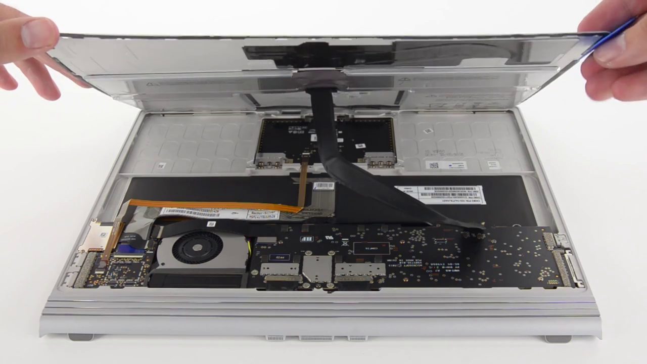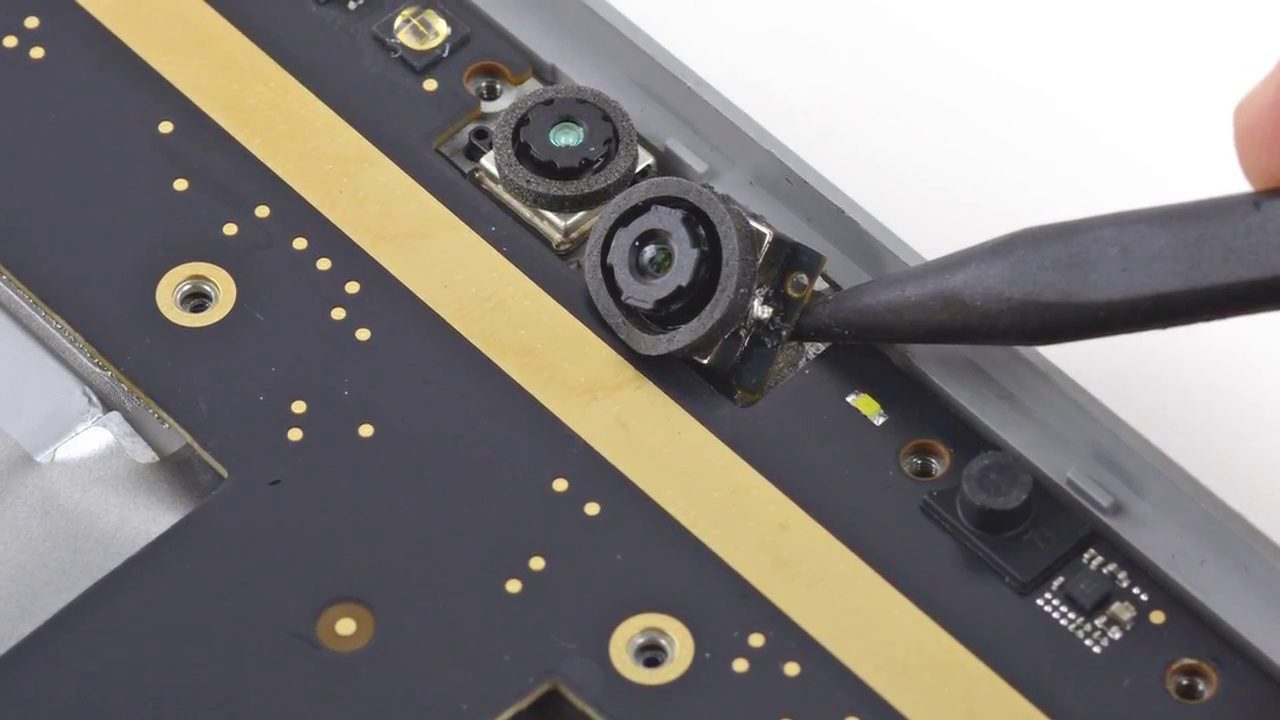 Un des capteurs photo ainsi que d’autres capteurs sont collés au châssis, ce qui rend leur extraction très délicate. C’est également le cas de la batterie qui est collée au boîtier. Pire encore, le panneau de verre de l’affichage et le panneau de cristaux liquides sont indissociables. Seule consolation, le SSD peut être facilement remplacé.