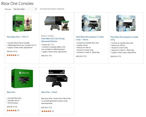 C’est le nouveau prix qui sera appliqué à deux offres : la Xbox One (sans Kinect 2 évidemment) accompagnée du nouvel Assassin’s Creed Unity ou de Sunset Overdrive. La console aux couleurs de Call of Duty Advance Warfare sera, elle, proposée à 450 dollars.