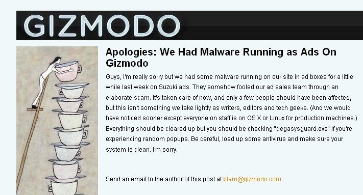 Le blog consacré aux gadgets technologiques a affiché sur ses pages des publicités Suzuki infectés par du code malveillant. Confronté à ces annonces, un internaute pouvait se retrouver avec un virus qui s’installait sur son ordinateur. Mardi 27 octobre 2009, le directeur de publication Brian Liam s’est excusé auprès des lecteurs sur le site mais sans s’étendre sur les détails de l’attaque.