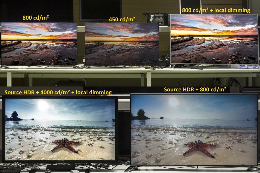 En revanche, ces écrans HDR ne feront pas vraiment mieux qu’avant en terme de profondeur des noirs : un peu moins de 0,01 cd/m² de luminosité (ce qui est déjà très bien). Pour ce faire, il faudra une dalle LCD à fort taux de contraste (technologie VA), doublée d’un rétroéclairage de type local dimming capable de s’éteindre derrière les zones noires. Ou, mieux encore : une dalle OLED, dont le noir est parfait (0 cd/m²). Seulement voilà, les dalles OLED sont encore loin d’être assez lumineuses pour afficher une source HDR.