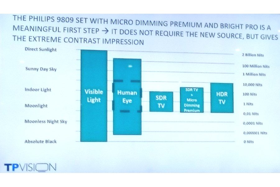 Pour aboutir à un affichage de type HDR, il faut que l’écran dégage une très forte luminosité. Actuellement, Philips peut monter la luminosité d’un téléviseur classique de 450 cd/m² à 800 cd/m². Et grâce à ses LED de rétroéclairage encore plus puissantes, leur prototype d’écran HDR (en bas à gauche sur la photo) est capable de monter jusqu’à 4000 cd/m² ! De quoi littéralement éblouir l’œil du spectateur.