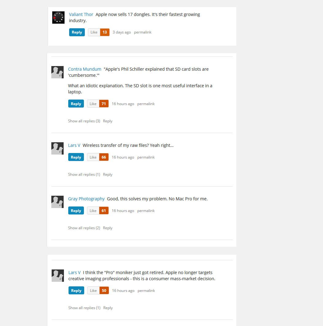 La photo est un domaine dans lequel Apple a toujours eu, à l’instar des communautés graphiques et vidéo, une grande part de marché. Sur DPreview, un site référent sur la photographie qui agrège une communauté très active, le nombre de commentaires (négatifs, en grande majorité) autour de la disparition du port SD génère autant voire plus de commentaires que des tests de boîtiers pourtant très attendus comme le RX100 Mark V !