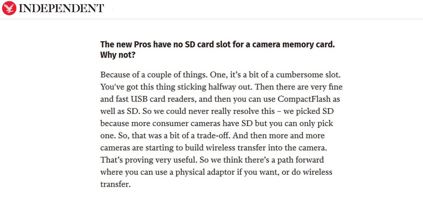 The Independant : Les nouveaux MacBook Pro n’ont plus de port SD pour les cartes mémoire des appareils photo. Pourquoi ?