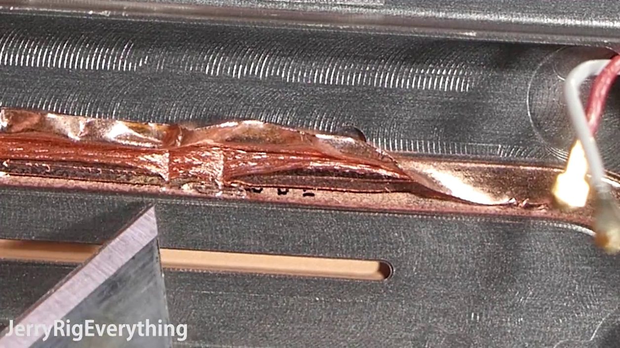 Samsung évoque un refroidissement liquide mais l’ouverture du tuyau aplati (heat pipe en anglais) qui canalise la chaleur vers l’extérieur ne révèle aucune présence de liquide. Seuls des fils de cuivre sont visibles dans la vidéo.