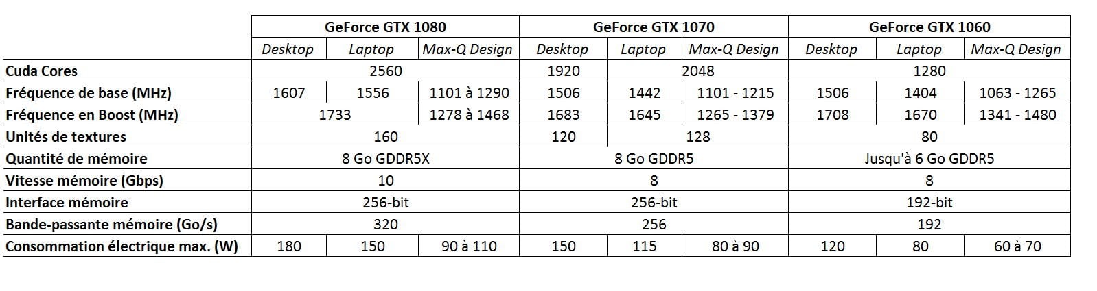 A y regarder de plus près, seuls le nombre d’unités CUDA (cœurs d’exécution), la quantité de mémoire embarquée (GDDR5 ou GDDR5X) et l’interfaçage du bus sont identiques à ceux des puces présentes dans les PC portables gaming actuels.
