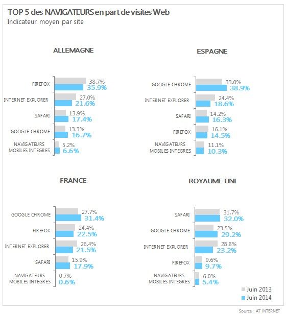 En juin 2014, la part de visites en provenance de Firefox a atteint 22,5 % contre 21,5 % pour Internet Explorer. Mais les deux navigateurs ont perdu du terrain au cours de cette année, puisqu’ils atteignaient respectivement 24,4 % et 26,4 % en juin 2013.