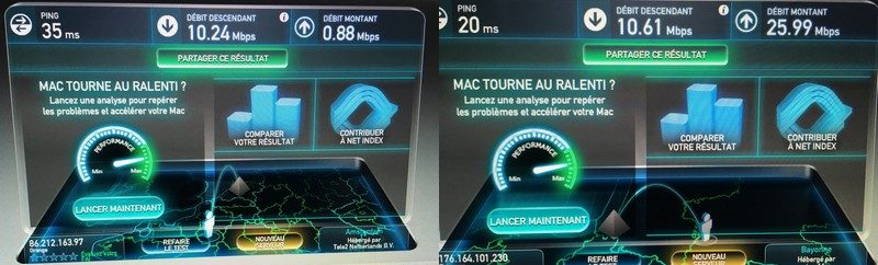 Notre ordinateur relié en filaire à la box 4G a même atteint plus de 25 Mbits/s en upload ( à droite ci-dessous) contre 0,88 Mbit/s relié en filaire à l’ADSL (à gauche ci-dessous) :