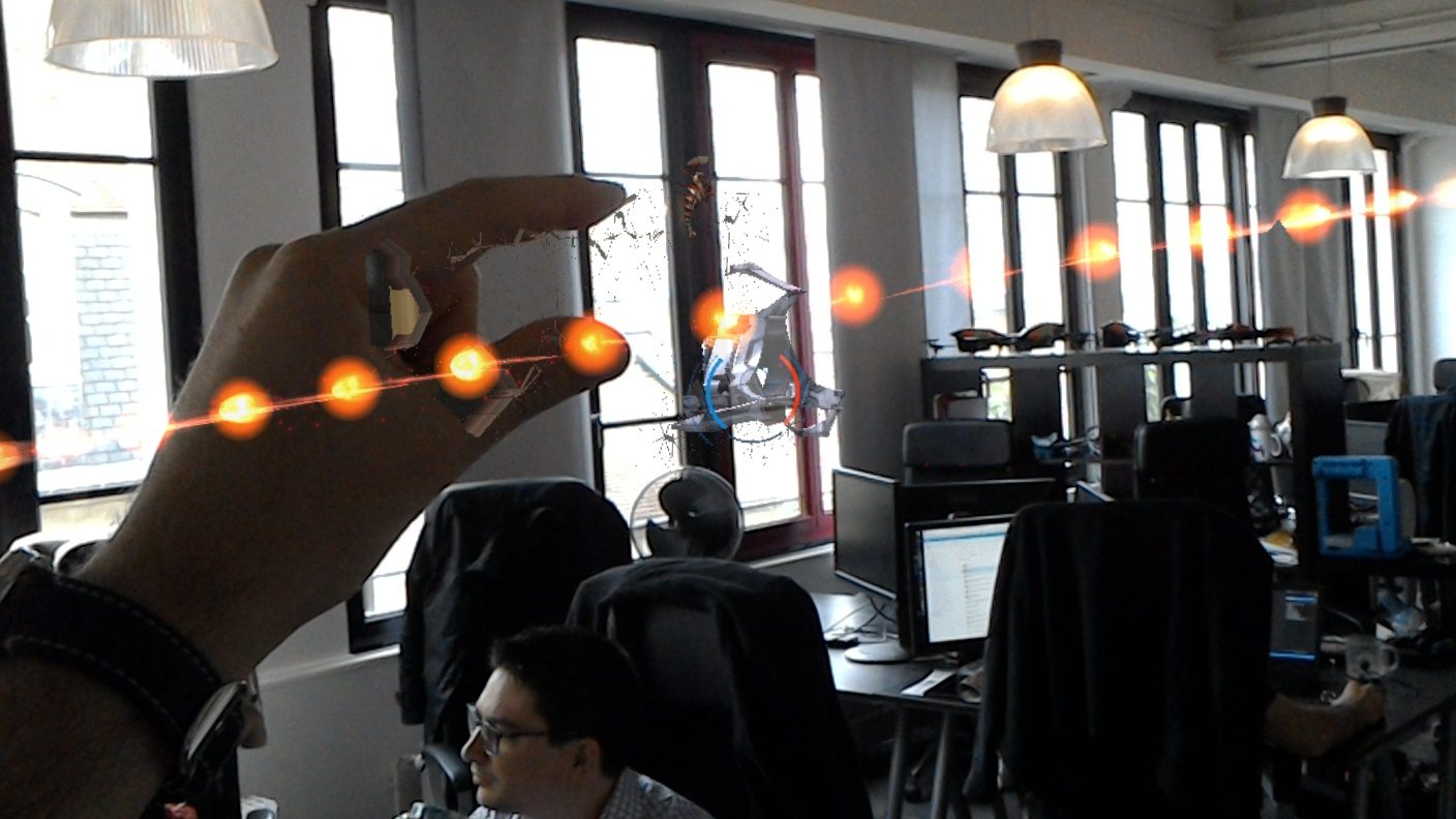 Pour partir sur de bonnes bases, nous avons opté pour un jeu simulant une attaque de drones. En quelques secondes, on se retrouve à lutter contre des vaisseaux dégainant leurs boules de feu, et brisant les murs de la pièce pour s’infiltrer. Le tout au milieu d’une quinzaine de programmeurs vaquant tranquillement à leurs occupations. Seul le son spatial – de très bonne qualité – leur permet alors de suivre nos aventures, de loin. Même si l’expérience est incomparable avec celle du HTC Vive (ce n’est pas le but), l’immersion est relativement bonne.