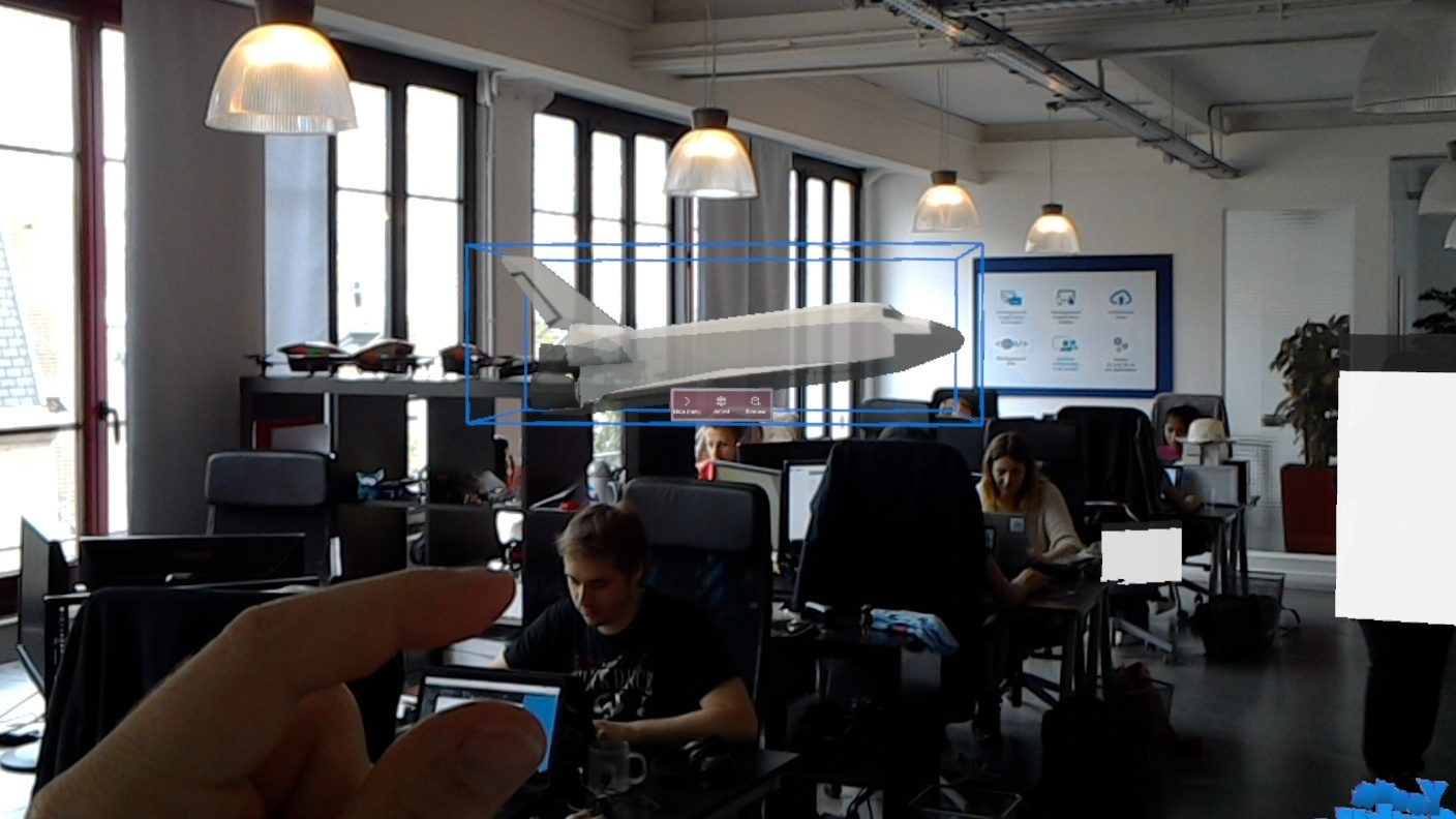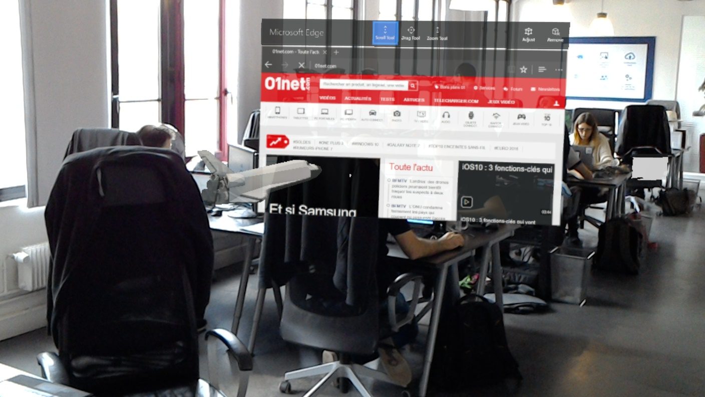 Longtemps fantasmé, HoloLens se montre bien plus réel depuis quelques mois. D’abord parce que Microsoft a dévoilé ses caractéristiques plus en détails. Puis parce que l’appareil a été commercialisé, du moins pour les développeurs. C’est chez l’un deux, Infinite Square – spécialiste du développement d’applications logicielles pour les entreprises, qu’on a pu se familiariser davantage avec le casque de réalité augmentée. Contrairement à notre précédent essai, nous avons pu expérimenter la chose sans la présence du fabricant, sans limite de temps, et dans un environnement des plus classiques : un open space.