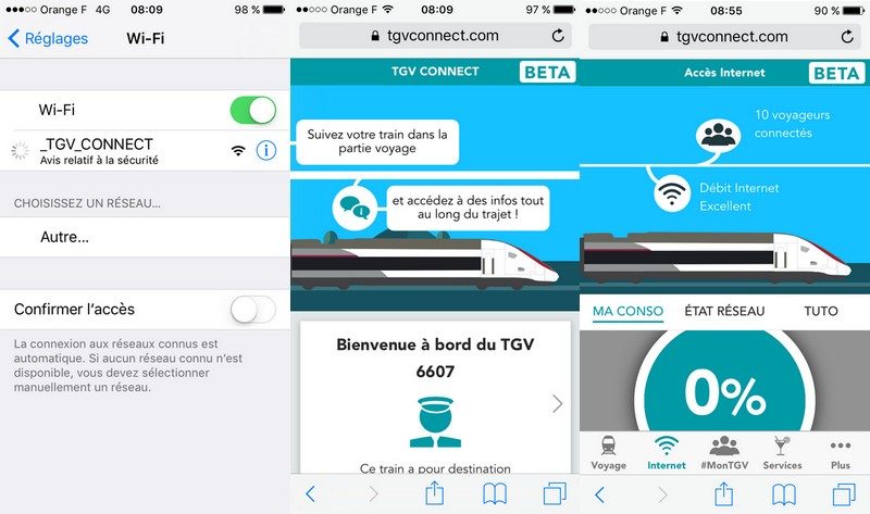 Deuxième déconvenue, les usages sont bridés. Impossible d’accéder à l’App Store ou au Play Store pour télécharger une application, ou à un service en streaming vidéo de type Netflix. “Ce que l’on propose, c’est un usage raisonnable d’une ressource limitée”, se défend Pierre Matuchet. Navigation internet, consultation et envoi de mails, TGV Connect a pour vocation de fournir une connectivité peu gourmande. Nous avons pu malgré tout sans problème utiliser YouTube ou regarder des bandes annonces sur AlloCiné. Nous avons également posté des photos sans difficulté sur les réseaux sociaux et passé des appels en FaceTime de bonne qualité.