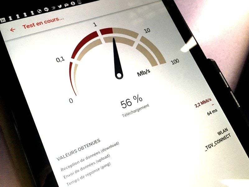 Nous avons mesuré le débit Internet avec l’application 01net.com Speedtest sur un smartphone HTC, un Iphone, un iPad et une tablette Nexus. Les quatre appareils ont obtenu à peu près les mêmes résultats. A savoir entre 1,7 et 2,8 Mbit/s en débit descendant et entre 1,1 et 1,4 Mbit/s en débit montant, pour un ping situé entre 64 et 46 ms. Des résultats de l’ordre d’une petite connexion ADSL, pas aussi bonne qu’à la maison. Mais surtout, ces performances restent très en-deçà de ce que l’on peut obtenir en 4G avec Orange dans le train en mouvement où nous avons atteint les 5,7 Mbit/s en download, 11 Mbit/sen upload et un Ping de 58 ms. De quoi hésiter à utiliser le Wi-Fi, à moins que l’on veuille absolument préserver son forfait mobile. D’autre part, vous n’aurez évidemment pas les mêmes débits si vous êtes chez un autre opérateur…