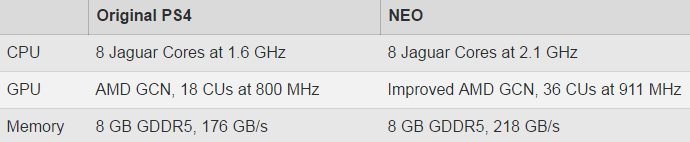 Si le processeur restera un AMD Jaguar à 8 cœurs, sa cadence passerait de 1,6 à 2.1 GHz. Le processeur graphique bénéficierait de 36 unités de calcul contre 18. La mémoire resterait quant à elle à 8 Go mais avec une bande passante plus élevée (218 GB/s contre 176). Le but de cette hausse de puissance est de proposer des jeux plus beaux et plus fluides, notamment en 1080p. Conformément aux précédentes rumeurs, la PS4 NEO supporterait également la 4K. Mais selon Giantbomb, la priorité de Sony serait d’éviter de créer un marché de la PS4 à deux vitesses.