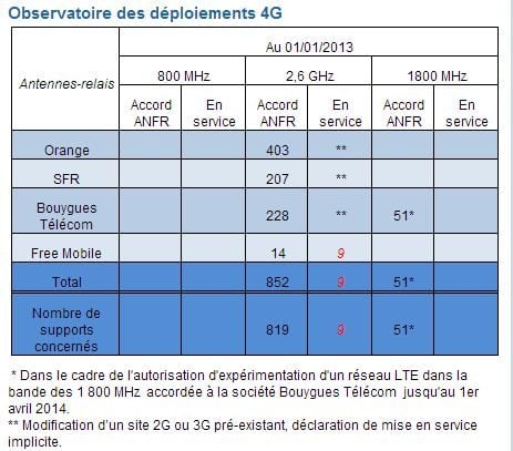 L’Agence nationale des fréquences (ANFR) a publié une mise à jour de l’observatoire des déploiements dans les réseaux mobiles 3G et 4G, au 1er janvier 2013 qui montrent l’avance d’Orange sur ses rivaux, et le retard patent de Free, dans le déploiement des réseaux cellulaires 4G.