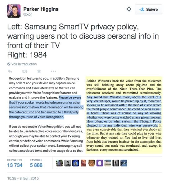 Parker Higgins, activiste au sein de l’Electronic Frontier Foundation a pris un malin plaisir à mettre en parallèle cette formule avec un passage du livre de George Orwell, 1984. « Le télécran recevait et transmettait simultanément. N’importe quel produit par Winston, supérieur à un faible murmure, serait enregistré par le télécran ». Evidemment, le produit de Samsung offre la possibilité de désactiver la fonction vocale.