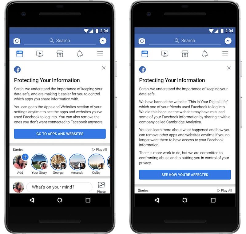 Facebook continue de faire amende honorable et tente de réparer les pots cassés. Comme l’a relevé Wired, le réseau social commence à afficher depuis quelques jours des messages d’alertes au haut du fil d’actualités des utilisateurs. Intitulé « Protéger vos informations », il permet à l’utilisateur de vérifier les réglages de confidentialité des applications et des sites web. Si l’utilisateur ou l’un de ses amis a utilisé l’application « This is your digital life » par le passé, le message est un peu différent. Dans ce cas, le réseau social l’informe que ses données ont « peut-être été partagées avec une entreprise appelée Cambridge Analytica », tout en précisant que cette application « a été bannie ».