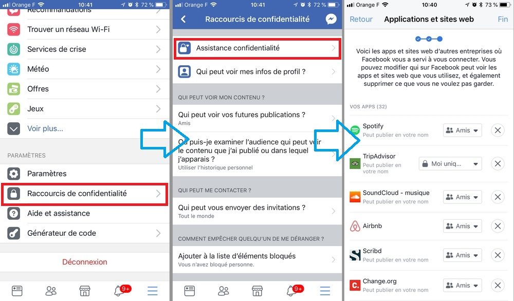 Que vous soyez alertés ou non par Facebook, il est vivement recommandé de vérifier ces fameux réglages de confidentialité. Il y a plusieurs manières d’y parvenir. Dans la section « Paramètres » du menu général, il suffit ainsi de cliquer sur « Raccourcis de confidentialité », puis sur « Assistance confidentialité ». L’utilisateur pourra alors consulter et modifier les privilèges d’accès des applications et des sites web qui ont accès à votre compte Facebook.