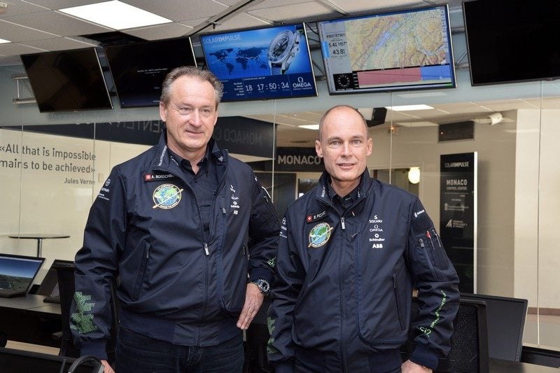 On se croirait dans Top Gun. Ce jour de février au Centre de Congrès Rainier III de Monaco, les Suisses Bertrand Piccard et André Borschberg apparaissent sanglés dans des tenues de pilote bleu-marine avec l’air déterminé d’un Tom Cruise s’apprêtant à risquer sa vie dans les airs. Ils sont venus préparer une aventure hors norme : accomplir le premier tour du monde sans une goutte de carburant avec leur avion Solar Impulse 2.