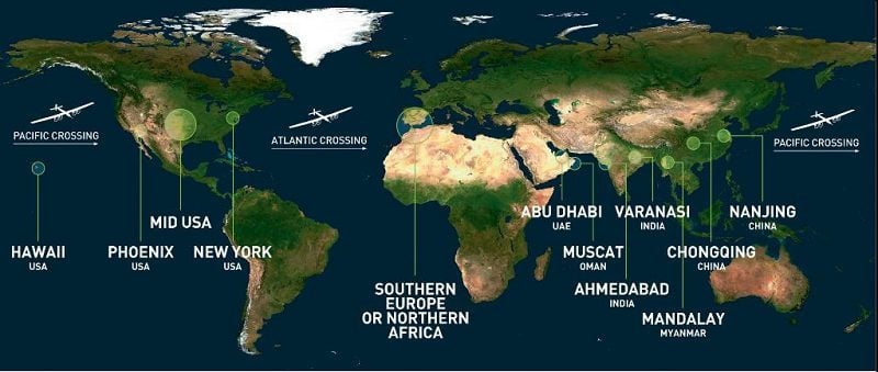 Pour ce faire, les pilotes vont tenter de boucler leur tour du monde en moins de cinq mois. Leur itinéraire prévoit de parcourir 35 000 kilomètres entre 50 et 100 km/h. 12 escales sont programmées : Mascate à Oman, Ahmedabad et Varanasi en Inde, Mandalay en Birmanie, Chongqing et Nankin en Chine. Lorsque l’avion aura traversé l’océan pacifique, il se posera successivement à Phoenix, New-York et une ville du Midwest aux Etats-Unis. Après avoir passé l’Atlantique, Solar Impulse 2 se posera en Europe du Sud ou dans le Nord de l’Afrique.