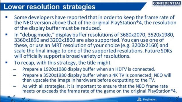 Le « mode debug » de la console proposera ainsi un tampon d’affichage de 3680×2070, 3520×1980, 3360×1890 et enfin 3200×1800. A noter que Sony ne permettra pas une définition en 1440p sur un écran 4K, la différence avec un affichage HD 1080p ne serait pas suffisante, selon le document fuité.