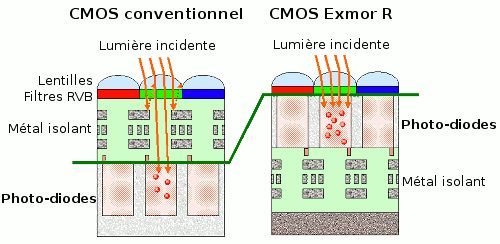 Lancé en 2008, Exmor R est un procédé dans lequel les photodiodes sont placées juste sous les microlentilles (le métal isolant était auparavant placé entre les lentilles et les photodiodes), une innovation majeure qui a permis à Sony de s’imposer dans toute l’industrie grâce aux très bonnes performances en basses lumières de ses capteurs. Sony a depuis amélioré le procédé avec l’Exmor RS, une version où l’électronique n’est plus placée sur les côtés du capteur mais à l’intérieur même du composant.