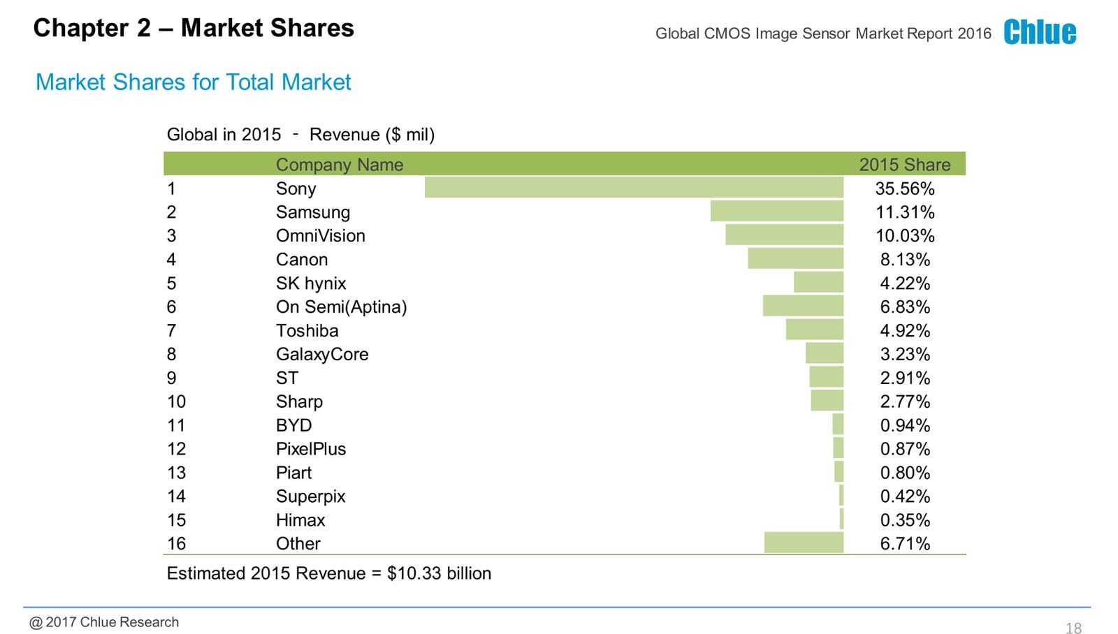 Qui pourra arrêter Sony dans sa course à la domination du monde des capteurs CMOS ? L’industrie compte de nombreux acteurs qui préparent le futur des capteurs – capteur organique, obturateur global, etc. Si Panasonic et Olympus sont évidemment des concurrents, il y a aussi OmniVision et On Semi qui performent dans certaines niches.