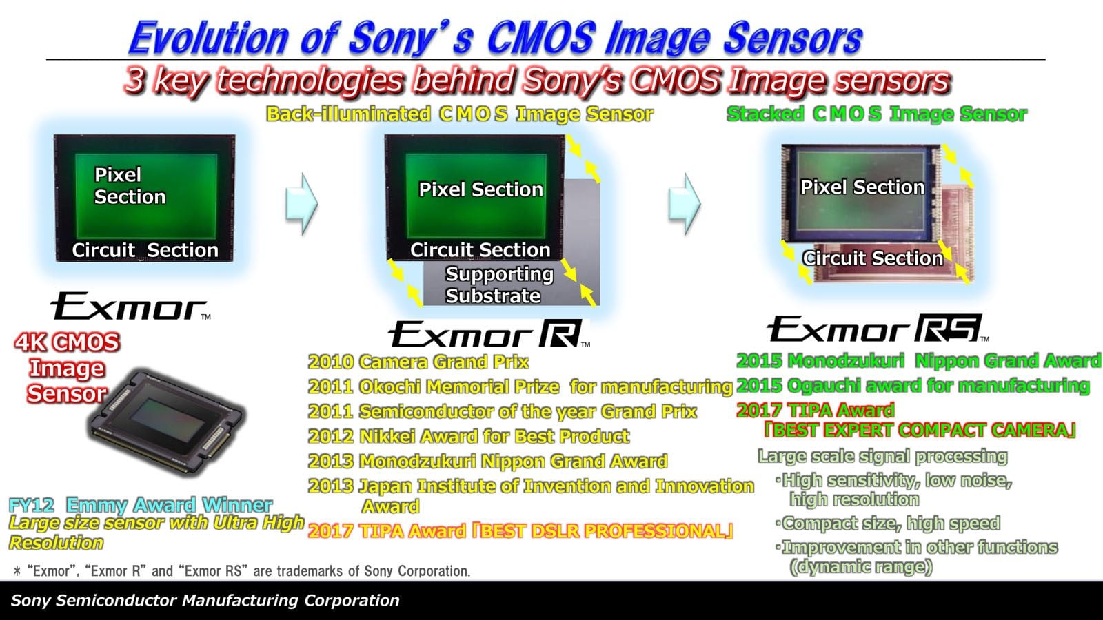 Certaines technologies de capteurs Sony sont bien connues des amateurs : parmi elles, Exmor, Exmor R ou Exmor RS, des mentions qui apparaissent aussi bien sur les appareils photo que les téléphones. Pour rappel, Exmor est la technologie initiale de capteur CMOS « by Sony » qui intègre un convertisseur analogique/numérique directement dans le composant.