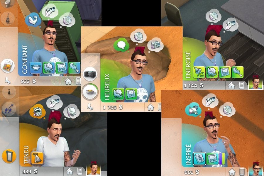 Tous les Sims ont un losange au-dessus de la tête, une sorte de baromètre de leur contentement (hygiène, vessie, divertissement, social, etc.) Quand tout va bien, il est vert. Si c’est la déprime, il passe au rouge écarlate. Et il y a quelques étapes intermédiaires. Il faut donc composer avec les humeurs et envies de votre avatar, essayer de répondre à ses moindres désirs et lui façonner une vie conforme à ses attentes sinon il sera triste et mourra de chagrin, de crasse, ou croulant sous les dettes. Littéralement.