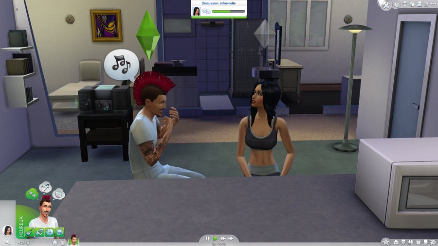 Sortie de la routine « boulot, pipi, douche, dodo », nous avons eu bien du mal à occuper notre avatar. Un peu de sport, un peu de guitare et de lecture, quelques rencontres et puis basta. Vous passerez plus de temps à regarder votre Sims passer des niveaux de compétences diverses et à s’améliorer que de réellement l’aider à s’épanouir ou s’amuser avec d’autres individus.