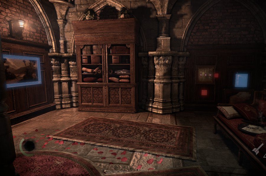 Tout est donc fait pour que vous désorientiez ou éliminiez les gardes de loin, à l’arc, avec le risque que le corps soit découvert. Pour les amateurs de cabrioles, le mieux reste tout de même que vous évitiez les ennuis en passant par les toits à condition de trouver l’endroit où grimper. Le plancher des vaches sera moins excitant et vous forcera à zigzaguer d’ombre en ombre.