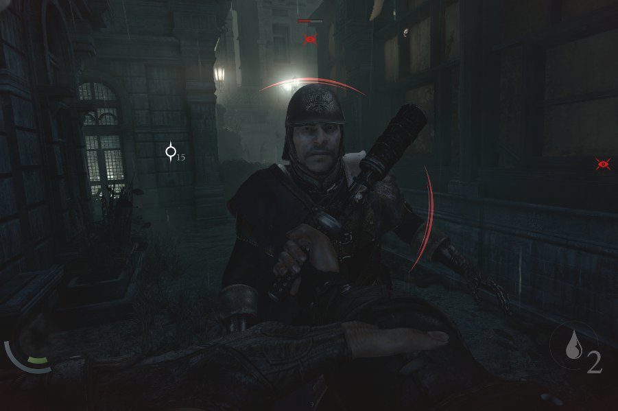 Lorsque vous vous déplacez en ville, la milice est relativement présente, sous forme de patrouilles ou de sentinelles en faction. Si ces dernières vous repèrent, dans la grande tradition des jeux d’infiltration, une alerte sonore retentit et un indicateur visuel apparaît au dessus de l’ennemi. Tant que ce dernier ne passe pas dans le rouge, il suffit de vous glisser dans l’ombre, même à deux pas, ou de reculer sur quelques mètres, sans courir, pour qu’il vous oublie… Efficace cette milice.