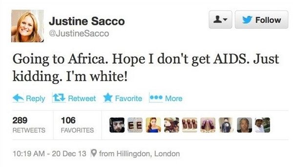 « Je pars pour l’Afrique. J’espère que je ne vais pas attraper le sida. Je blague. Je suis blanche ! », avait lancé la jeune femme avant d’embarquer pour un vol en direction de l’Afrique du Sud le 20 décembre. Malheureusement pour elle, son message a été transmis à un employé du site Buzzfeed.com, qui lui a assuré une large diffusion, racontent les médias américains.
