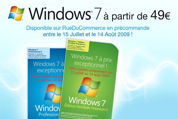 Dans le cadre de cette promotion, Windows 7 Edition Familiale Premium sera vendu 49,99 euros sur le site Microsoft Store (au lieu de 199,99 euros au tarif standard), et Windows 7 Professionnel, 109,99 euros (au lieu de 309 euros). L’offre sera également proposée par certaines enseignes partenaires, comme RueDuCommerce, LDLC, Pixmania, la Fnac ou Surcouf, à peu près au même prix.