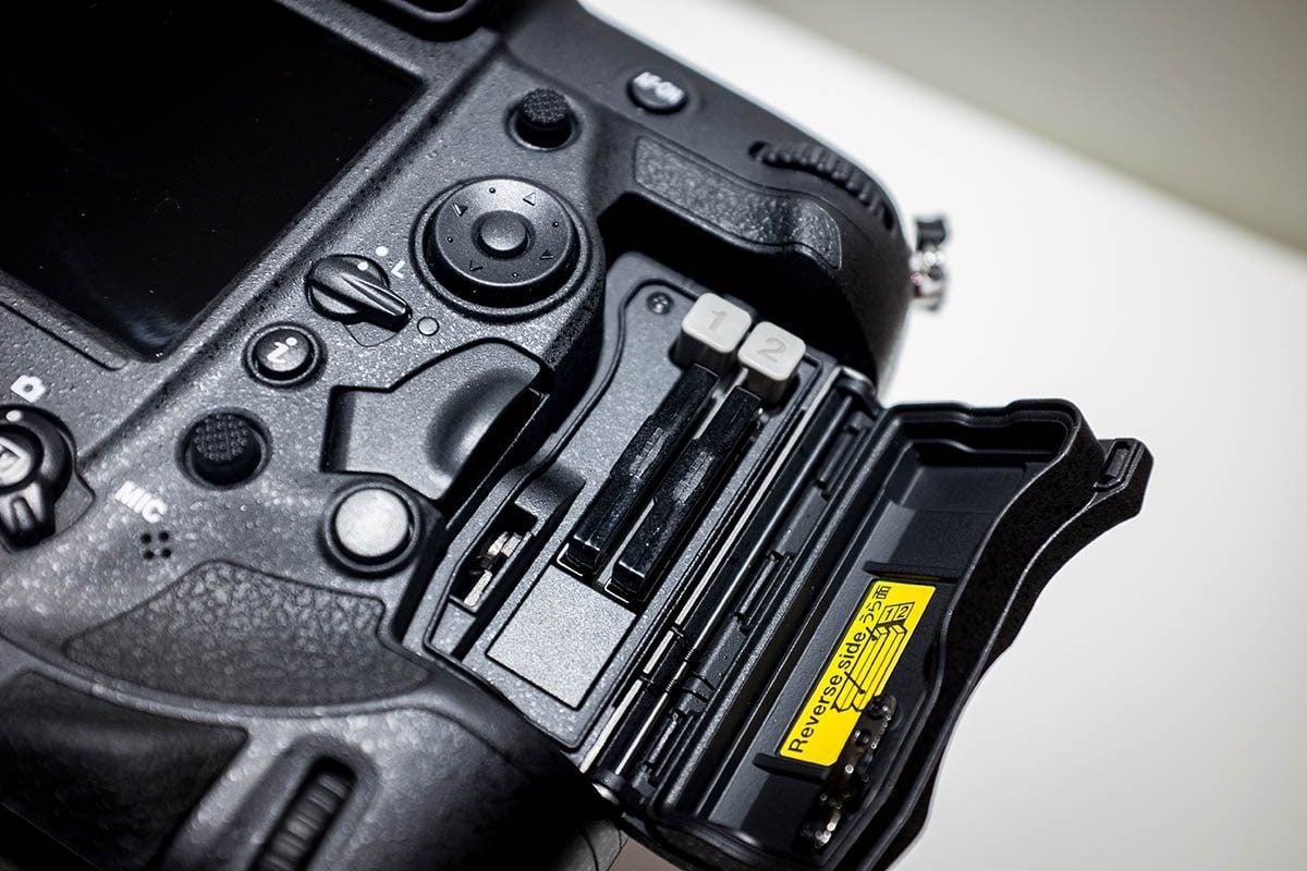Le D5 est le premier boîtier de la gamme à faire totalement disparaître la vénérable Compact Flash. Jusqu’au D4S, le boîtier pro de Nikon disposait d’un port CF et d’un port XQD, un format plus moderne et plus rapide. Le D5 tire un trait sur la CF et ne propose que deux ports XQD 2.0.