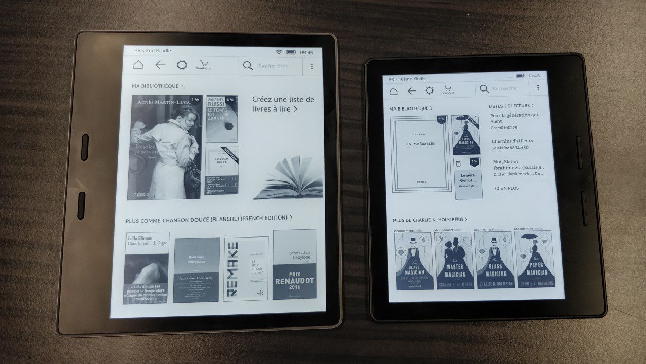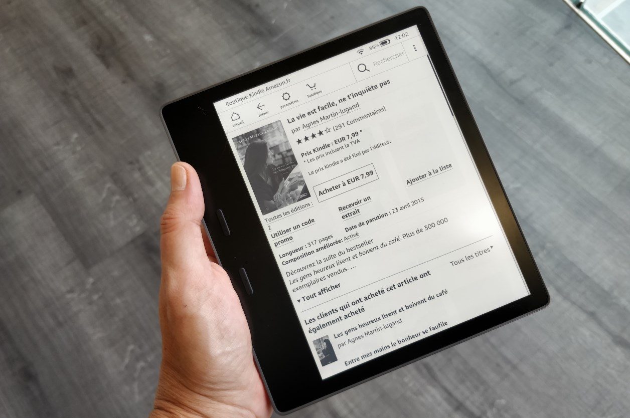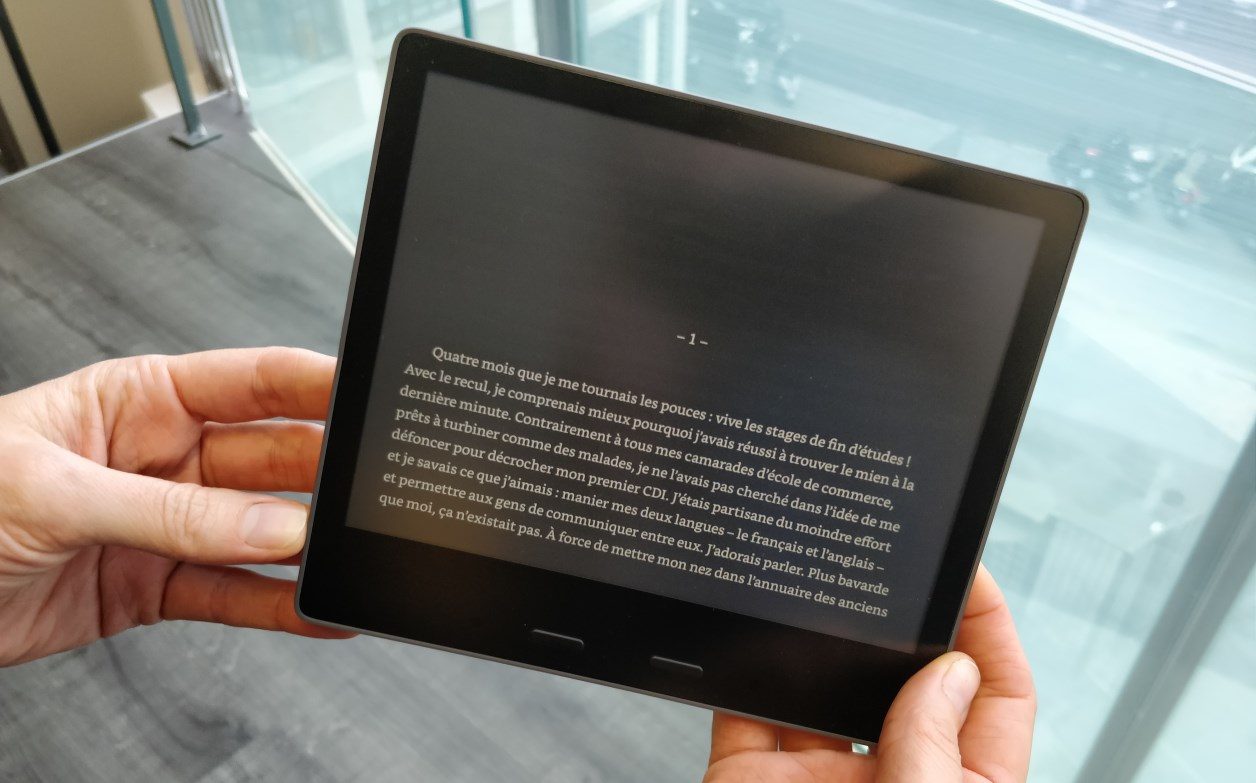 Si la liseuse semble un peu plus imposante, c’est tout simplement parce que son écran affiche désormais – et pour la première fois en France dans cette gamme – une diagonale de 7 pouces. Soit, selon Amazon, la possibilité d’afficher 30 % de texte supplémentaire sur une page, à taille de police équivalente. L’utilisateur tourne ainsi moins souvent la page et préserve par conséquent mieux l’autonomie de sa liseuse. (rappelons qu’un écran e-ink inactif ne consomme pas !)