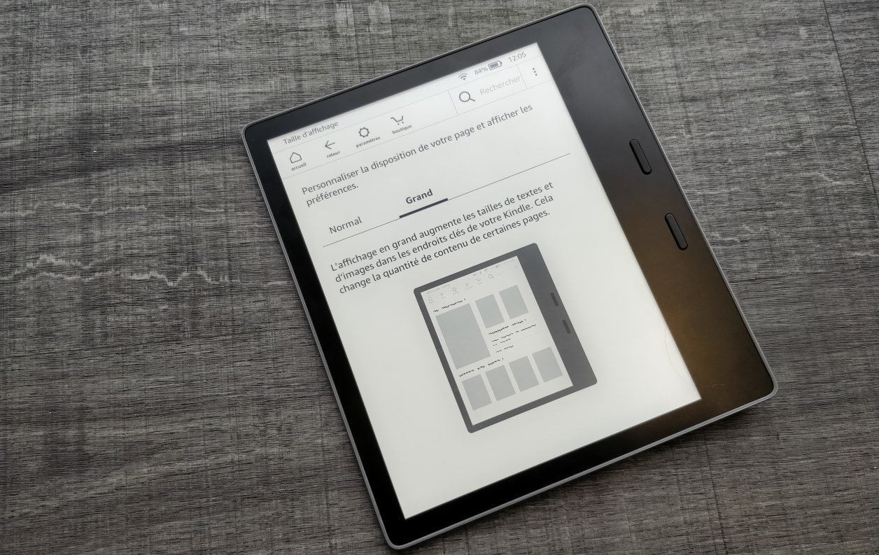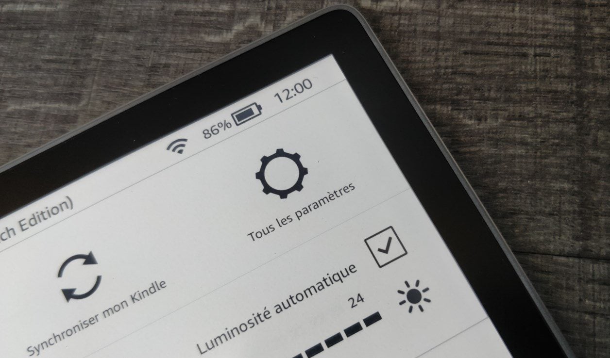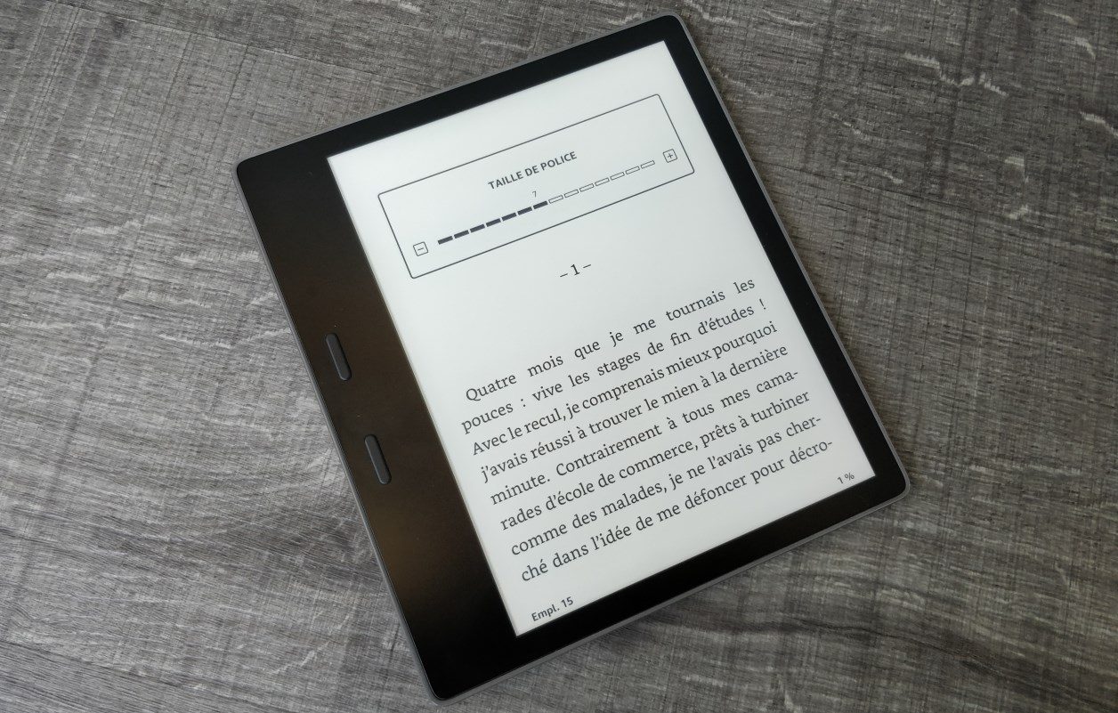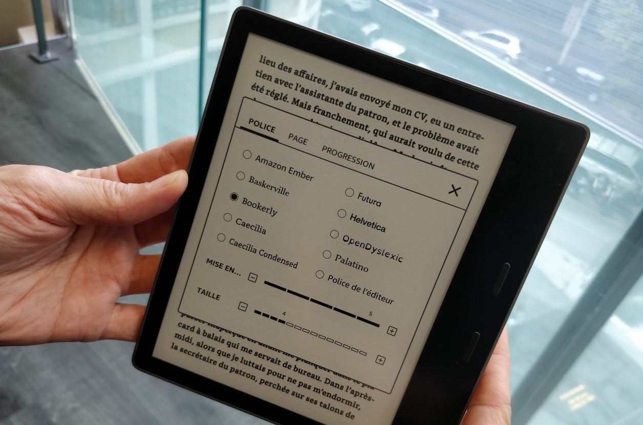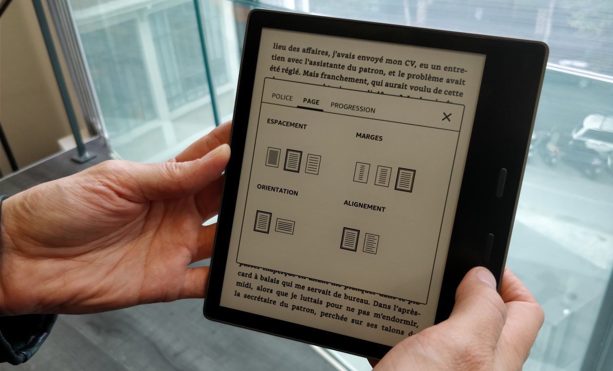 La technologie d’encre électronique employée reste de l’e-ink Carta (ici en version 1.2) qui assure des fonds de page bien blanc et de beaux contrastes. Pour renforcer ces derniers, Amazon propose une option qui permet de graisser la police de son choix, sur 5 niveaux. En mode page, la justification centrale n’est plus l’unique possibilité qui s’offre au consommateur. Il peut choisir une justification uniquement à gauche.
