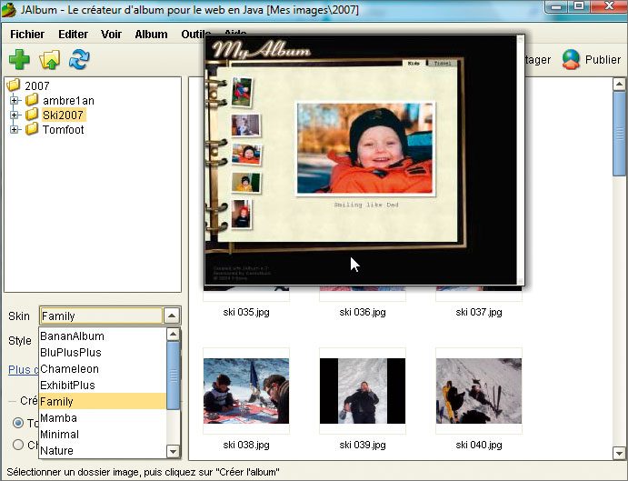 propres albums photo et les mettre en ligne comme un grand.C’est ce que propose Jalbum, qui ne nécessite pas de connaître la moindre notion de HTML ou autre langage de programmation. Quelques clics suffisent pour réaliser des albums photo de grande qualité.D’abord, il faut sélectionner le dossier contenant les clichés. Ensuite, on choisit l’un des modèles inclus, et c’est tout ! En cliquant sur ‘ Voir l’album ‘, on obtient un aperçu de