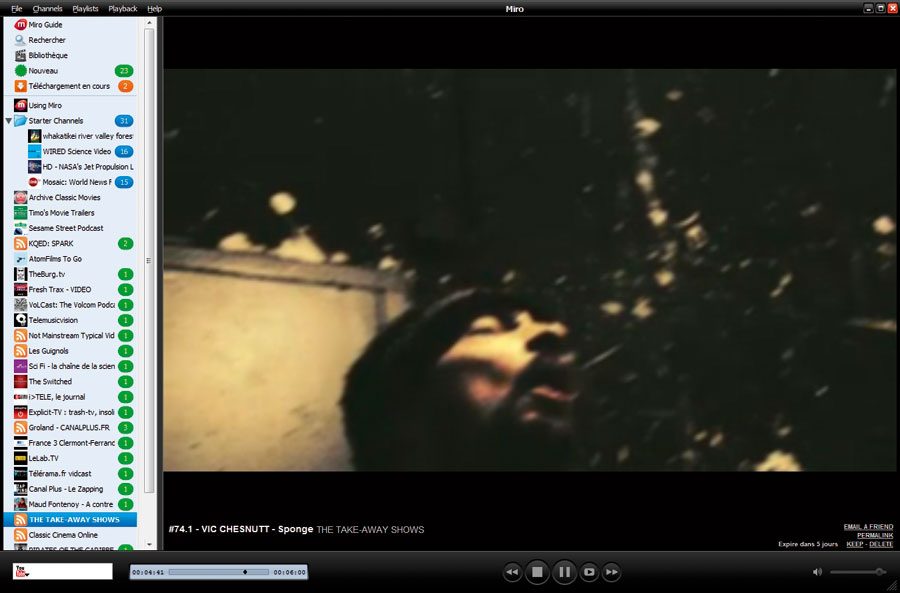 d’Internet : journaux télévisés, bandes-annonces, clips, voire quelques films, éventuellement en haute définition.Une fois le site sélectionné, Miro télécharge et classe automatiquement les vidéos. Pas toujours avec pertinence. Impossible, également, de lancer une recherche simultanée sur plusieurs sites de vidéo.