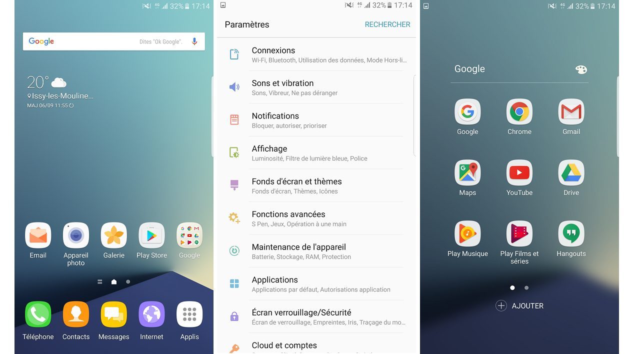L’interface TouchWiz évolue quant à elle légèrement par rapport aux Galaxy S7. Cela se remarque notamment dans le menu des paramètres, remanié pour l’occasion. Les panneaux latéraux sont toujours présents et accessibles depuis l’un ou l’autre des bords incurvés de l’appareil. Ils offrent un accès rapide à des applications, des contacts ou des actions rapides (rédiger un message, démarrer le dictaphone ou encore prendre un selfie).