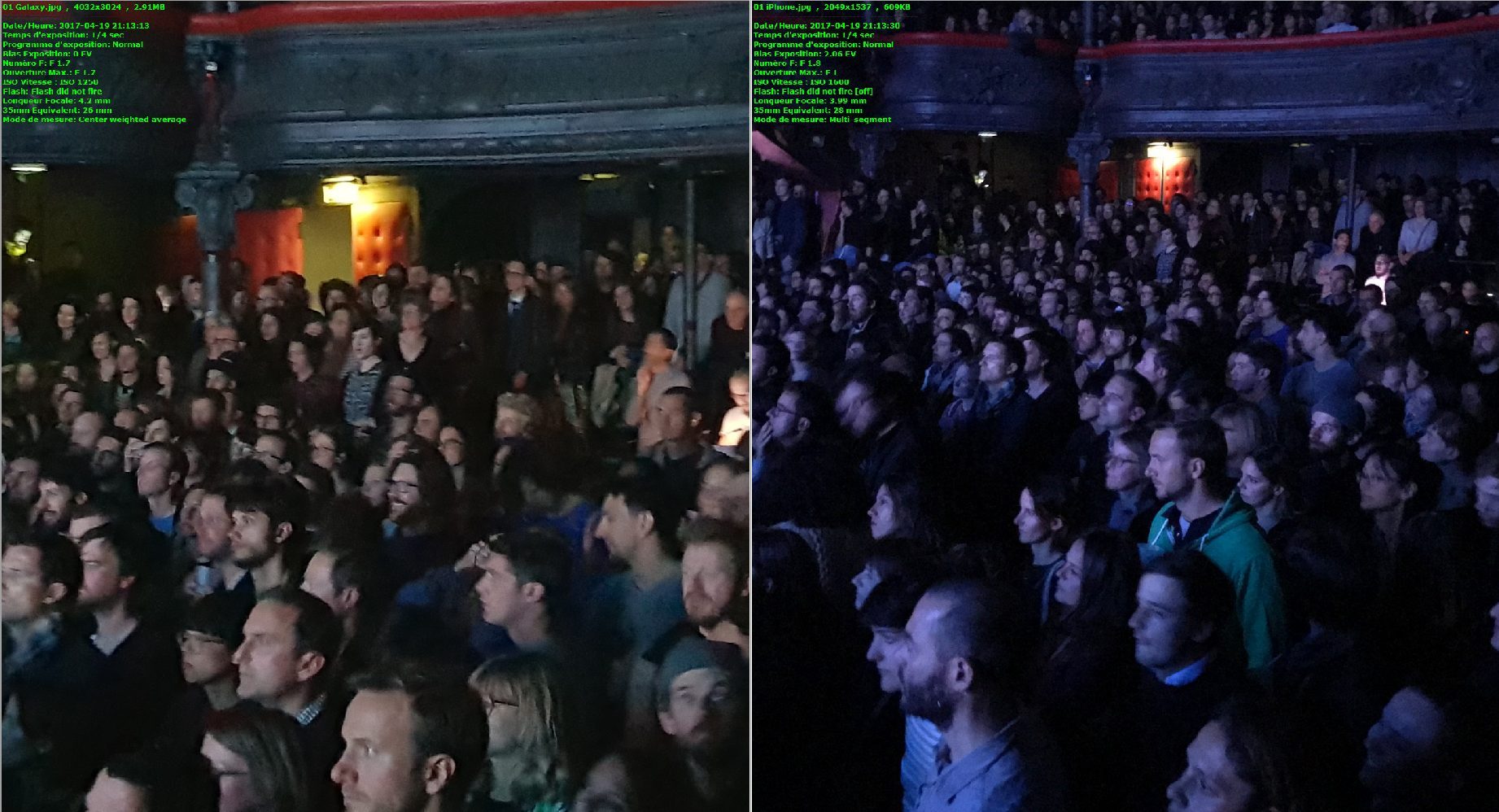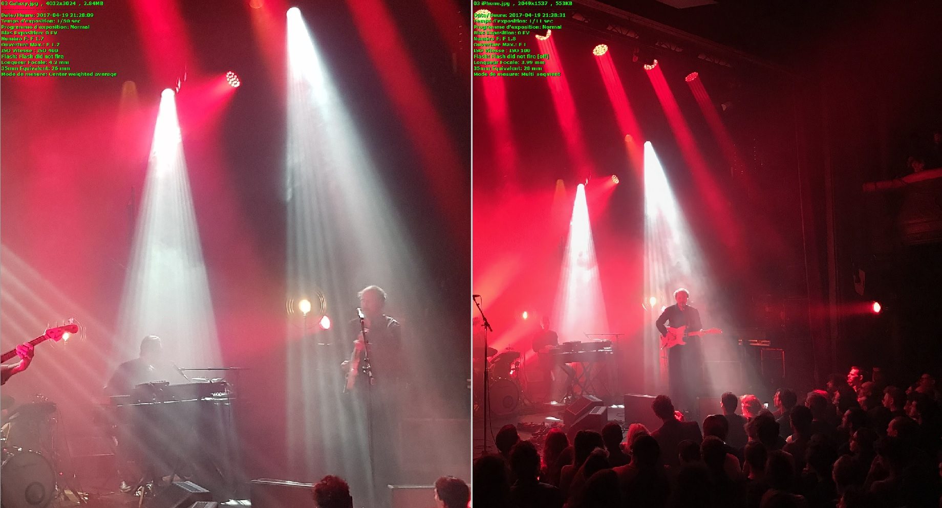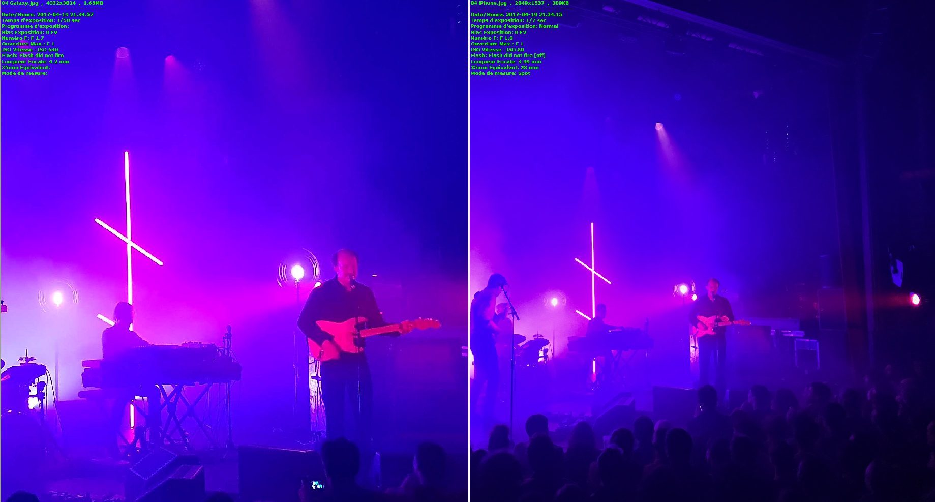 Malgré cela, le rendu des couleurs nous a semblé plus cohérent sur l’iPhone, en témoignent les photos de concert ci-dessus. Le public alors éclairé par une lumière bleue est restitué comme tel par l’iPhone 7 Plus, tandis que le Galaxy S8 Plus utilise sa balance des blancs calée sur les vidages pour réajuster les couleurs. Il laisse alors ressortir le public en lumière blanche. C’est moins proche de la réalité mais plus flatteur.