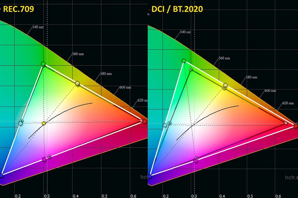En mode Cinema Pro, les couleurs sont très fidèles (Delta E moyen entre 1,25 et 2,52 selon nos sondes), et les gris très propres malgré une température un peu élevée d’environ 7300°K en moyenne (certainement pour compenser la tendance des dalles Triluminos à tirer vers le rouge). On pourra même pousser le gamut un peu plus loin, en mode DCI-P3, pour enrichir les rouges et les verts sans trop nuire à la fidélité globale des couleurs (Delta E moyen de 3,1). C’est beau, c’est équilibré, un vrai plaisir.