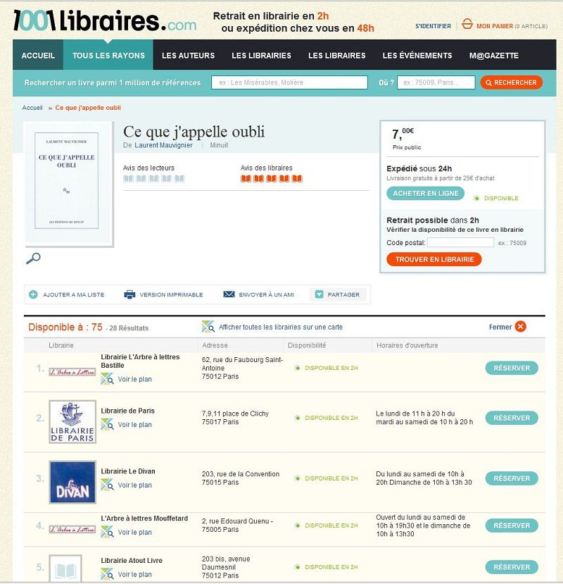 Les amateurs de lecture vont pouvoir sélectionner un livre en ligne et, grâce au moteur de recherche géolocalisé, savoir quelle est la libraire la plus proche de chez eux qui l’a en rayons. 1001libraires s’appuie sur un réseau constitué de 219 boutiques à Paris et en province, dont le stock est mis à jour quotidiennement. Petit plus : le client a la possibilité de réserver le livre, il sera à disposition en boutique dans les deux heures.