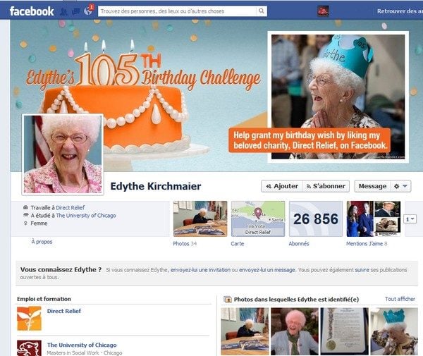 Non, il n’y a pas que des adolescents sur Facebook. Il y a aussi des adultes. Et des seniors… dont une Américaine de 105 ans, Edythe Kirchmaier, a révélé ABC News. Cette vieille dame a rejoint Facebook en janvier 2013. L’association caritative Direct Relief international, pour laquelle elle travaille bénévolement depuis quarante ans, lui a en effet ouvert un compte pour son anniversaire.