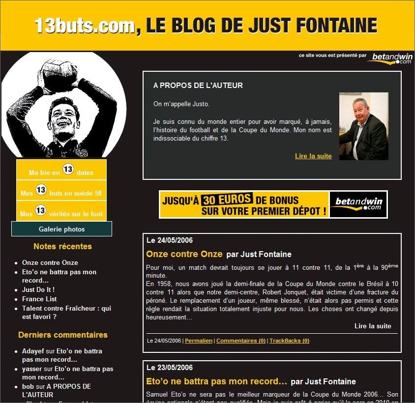 aussi ses 13 vérités sur le foot ?” dommage qu’on ne puisse pas les commenter ?”, décrit ses 13 buts de 1958 et livre quelques photos. Un blog à sa gloire, en somme.
